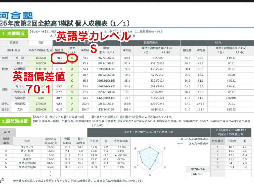 【速報】高1 W.Wさん 全統高1模試結果 英語偏差値70超え